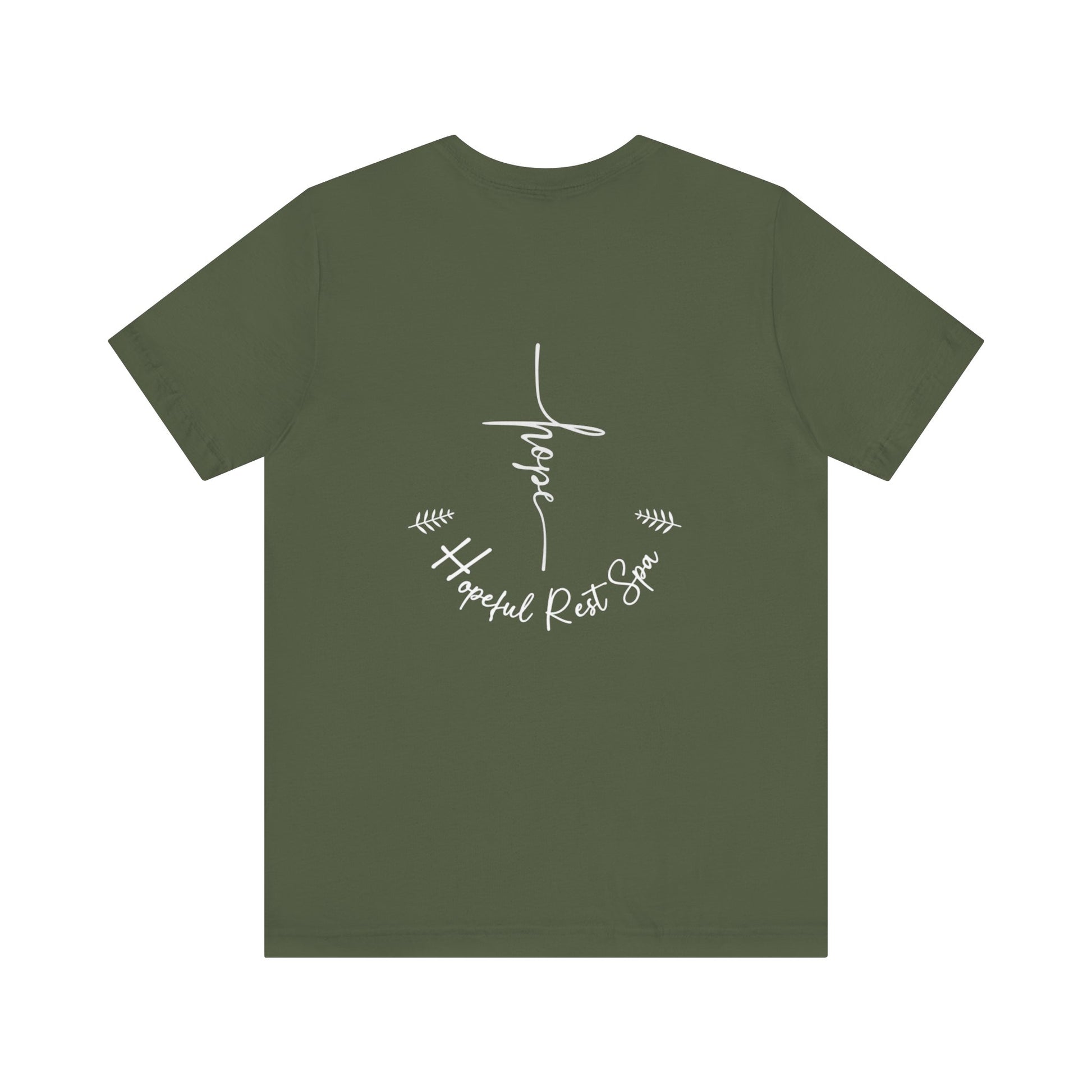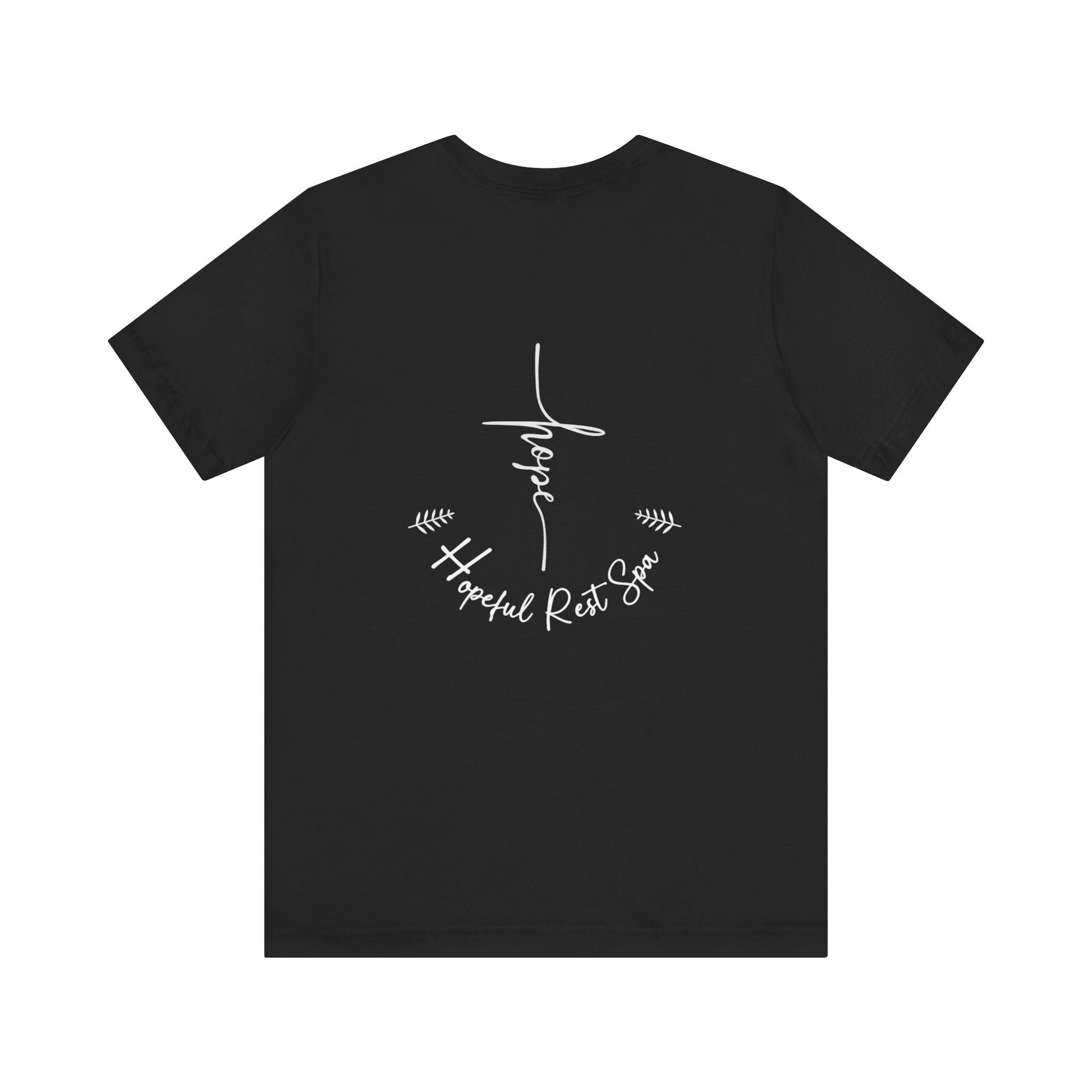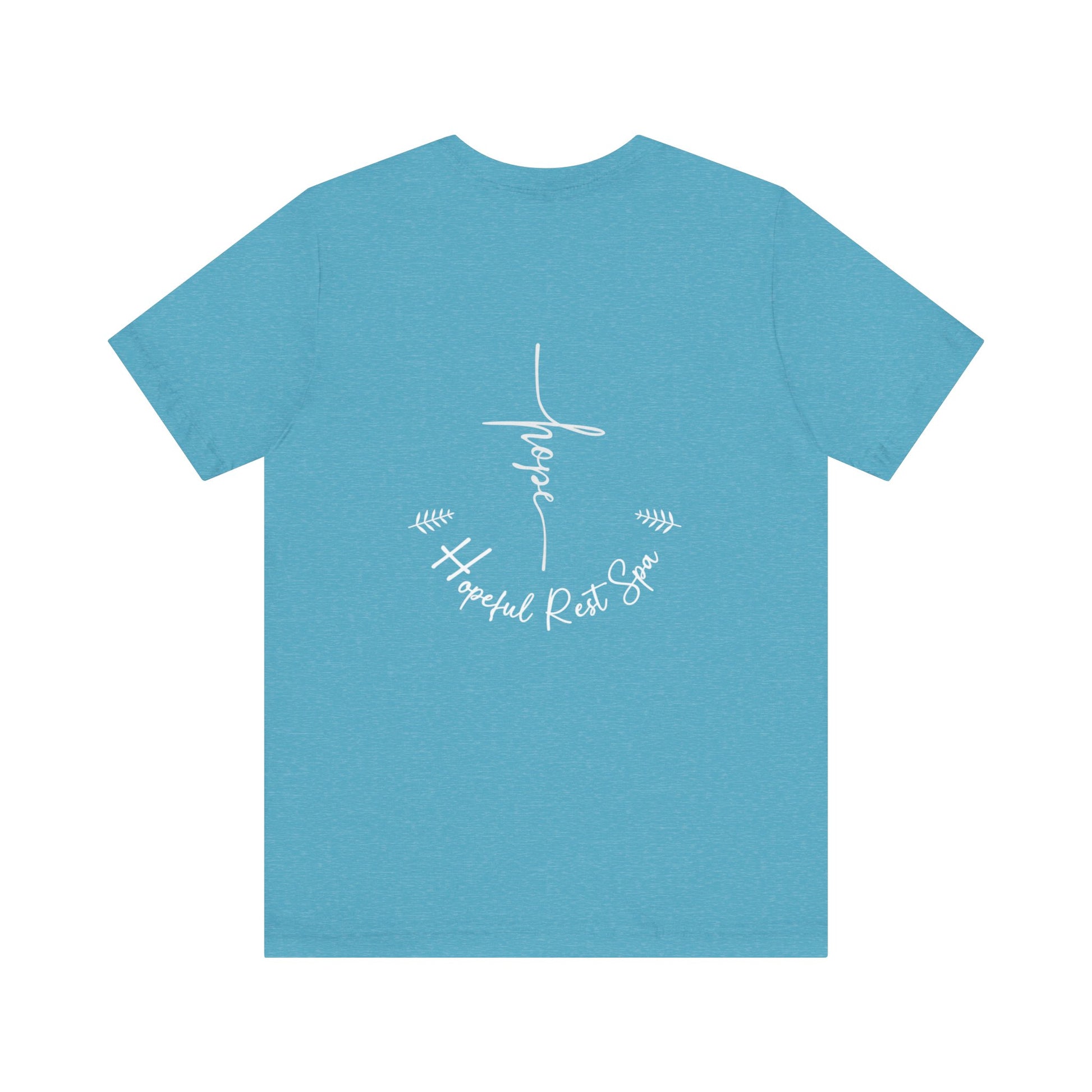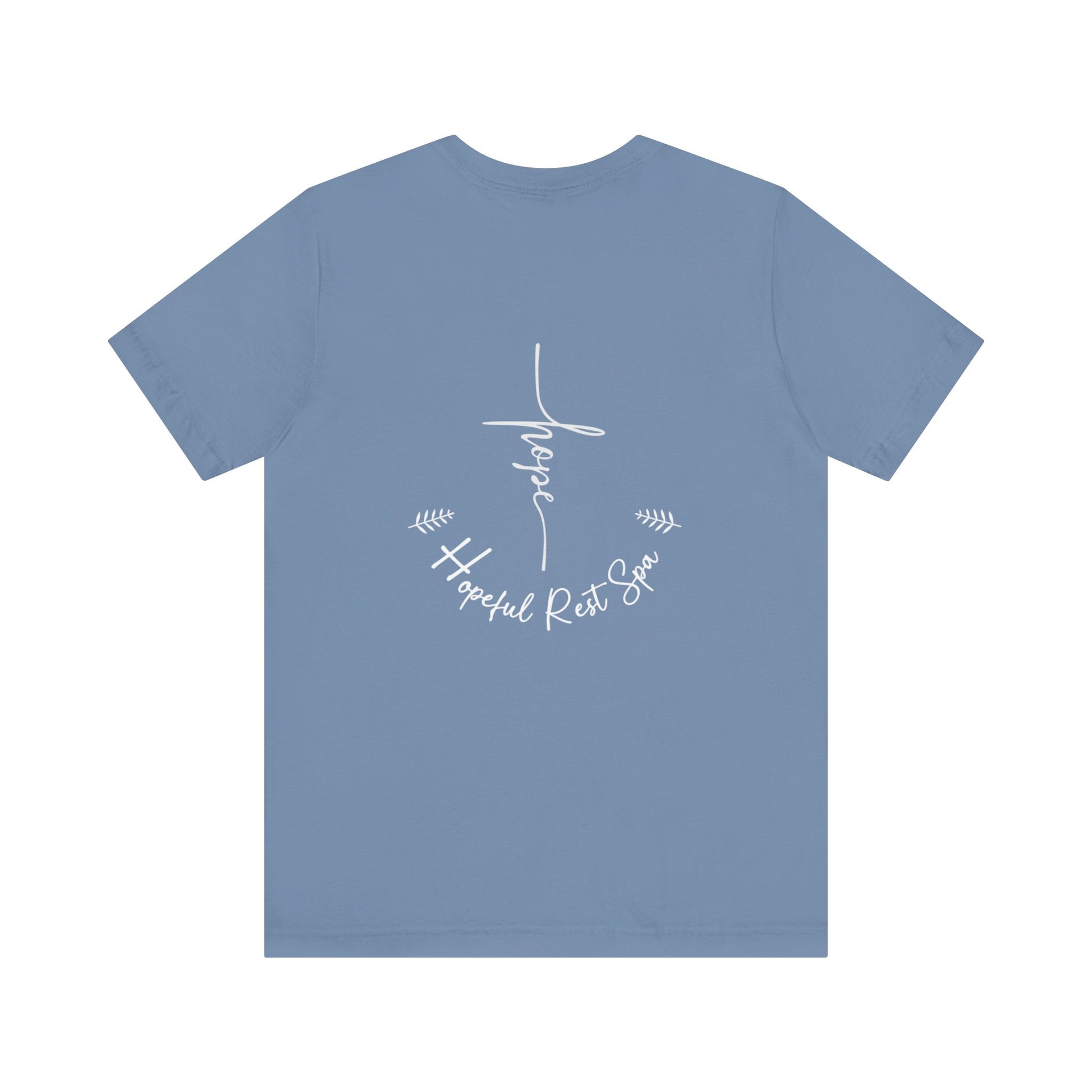Soft and comfortable unisex shirt (Bella+Canvas) with a Hope design on the front and Our Hopeful Rest Spa logo on the back. Suitable for everyday wear, this shirt exudes a sense of positivity and relaxation. Perfect for those looking for a casual yet stylish wardrobe staple. Ideal for individuals who appreciate inspirational and soothing themes. Relevant for occasions such as casual outings, lounging at home, and wellness retreats.