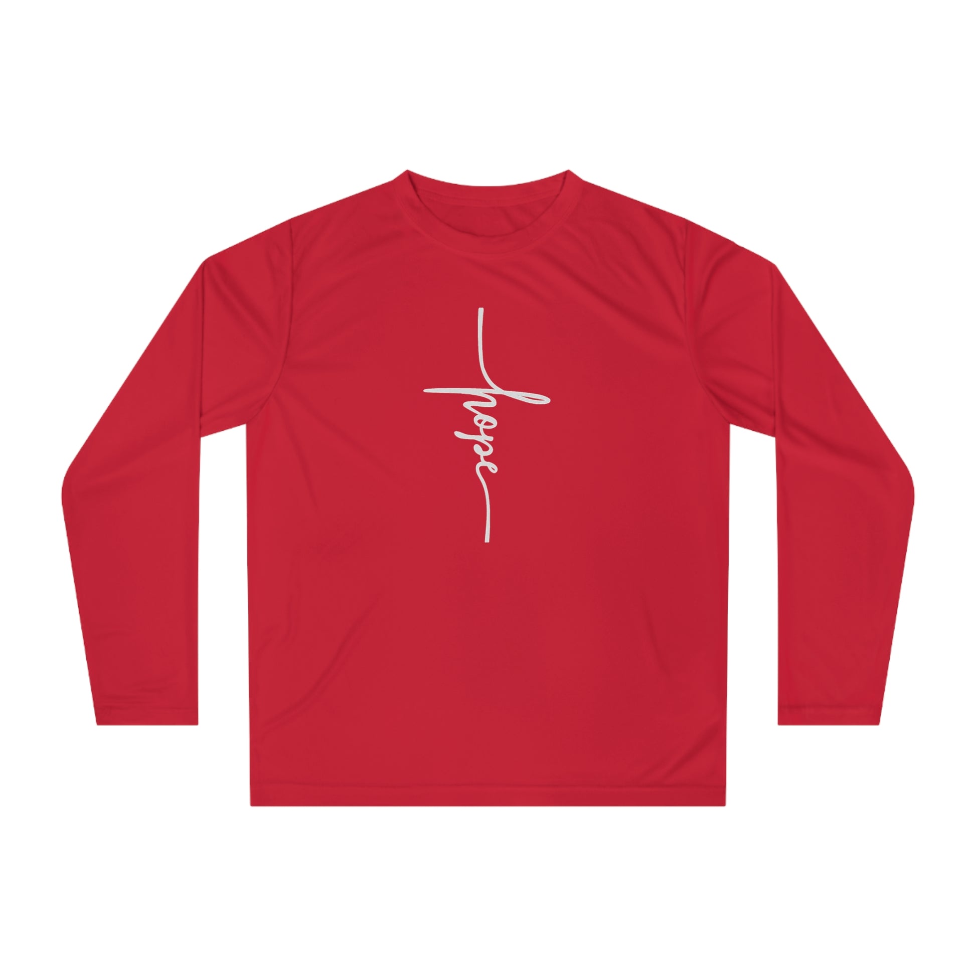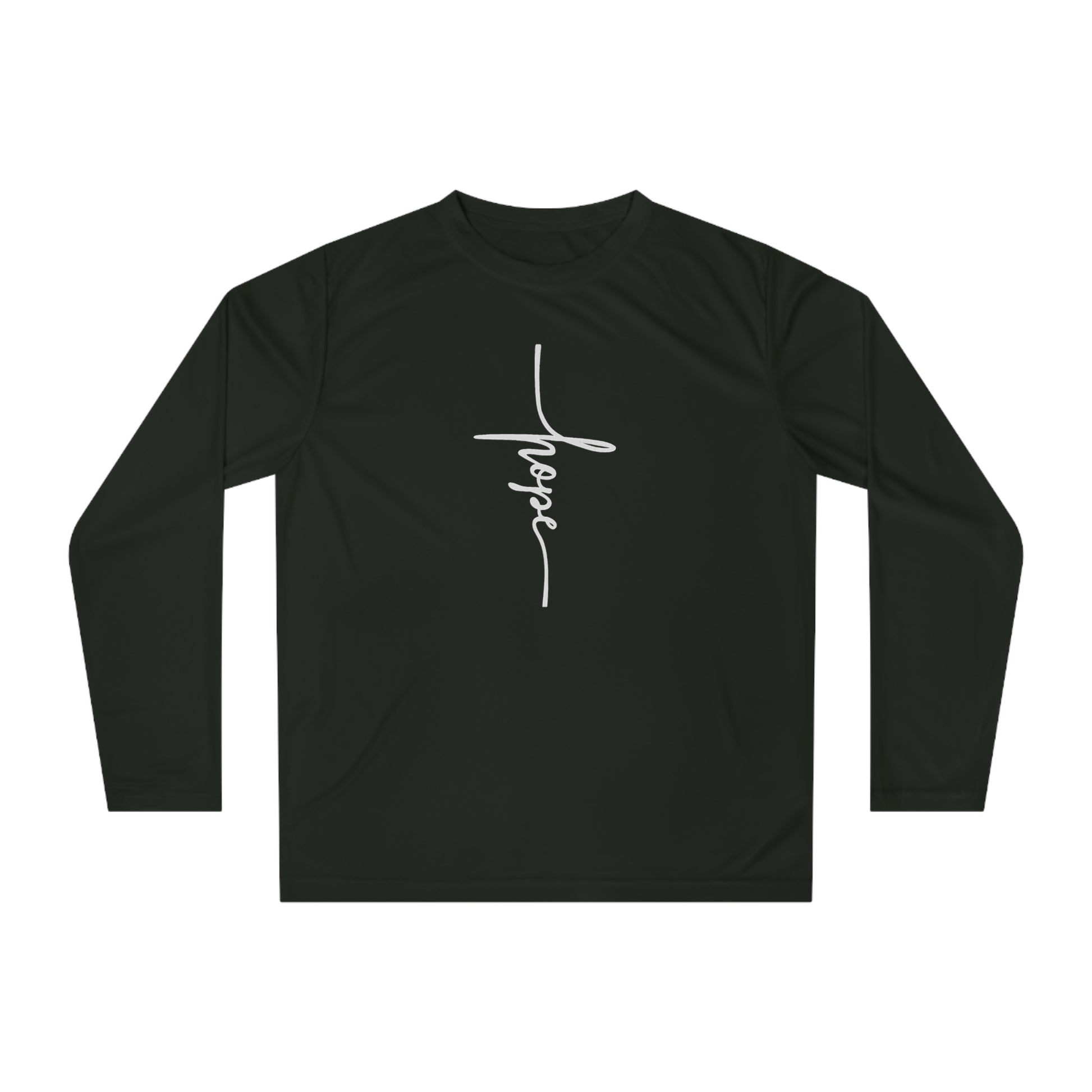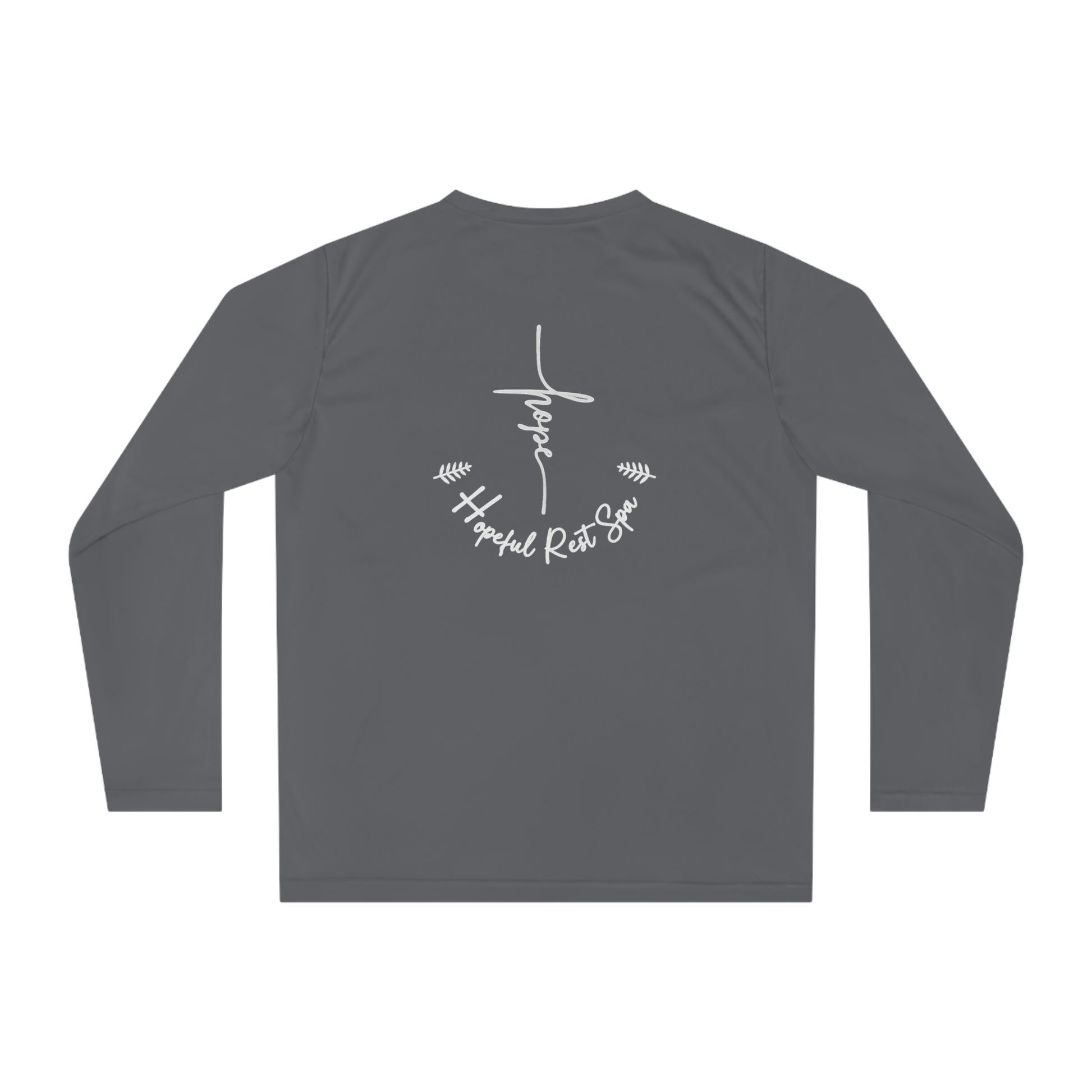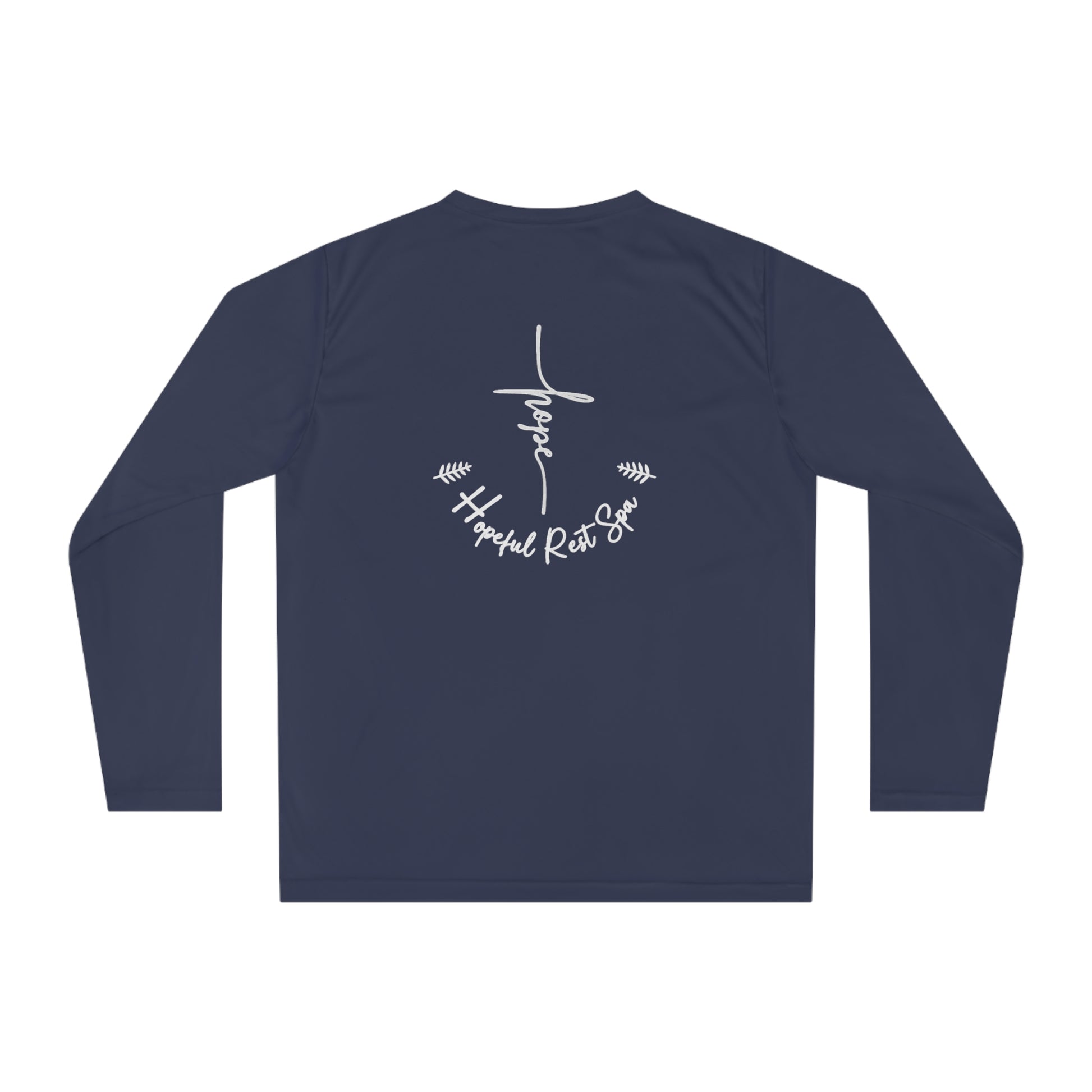 Designed for action, this custom sports shirt is made with 100% moisture-wicking polyester to keep you dry and comfortable during peak performance. With 40+ UV protection and cationic dyes for vibrant colors, this long-sleeve shirt is perfect for athletes and active individuals. The Hope design on the front adds a touch of faith to your workout attire. Our Hopeful Rest Spa logo is on the back. Ideal for sports enthusiasts, fitness lovers, and anyone looking for high-performance activewear. Perfect for outdoor activities, sports events, and everyday workouts.
