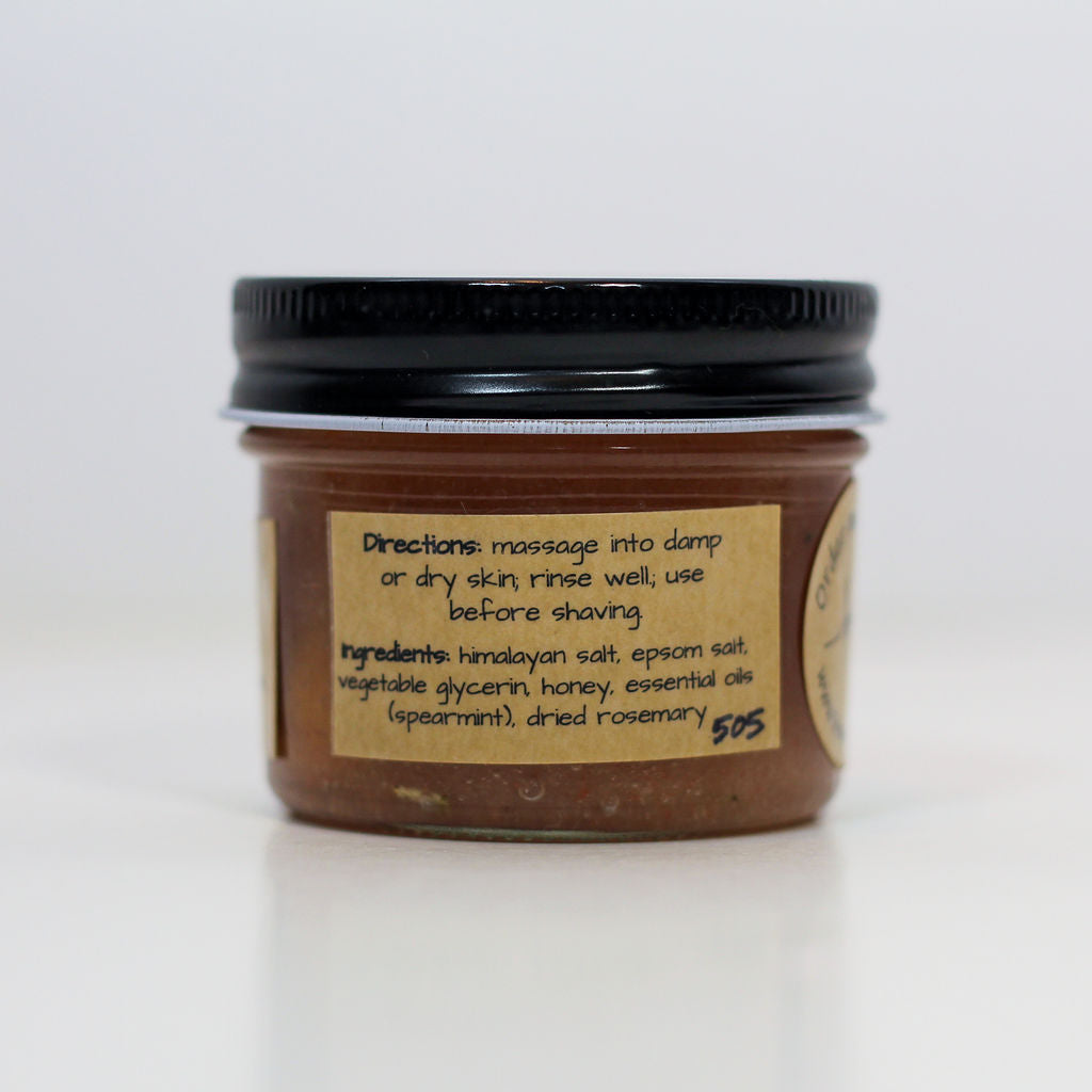 4 oz. jar, Contains Epsom salt, fine grain Himalayan salt, organic vegetable glycerin, and organic honey. Perfect for exfoliation before shaving. Follow up with your favorite whipped body butter for silky smooth skin. May reduce the appearance of cellulose.