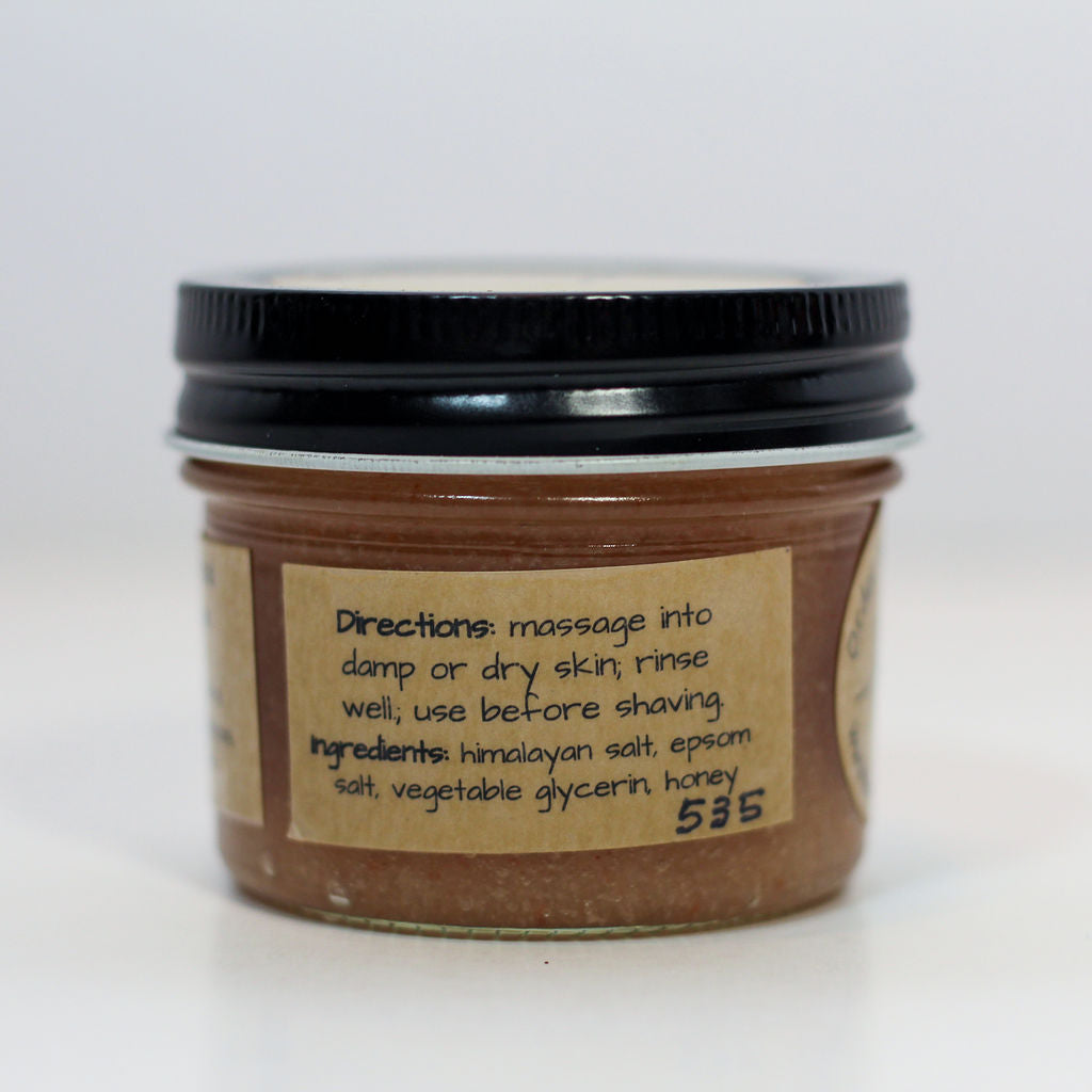 4 oz. jar, Contains Epsom salt, fine grain Himalayan salt, organic vegetable glycerin, and organic honey. Perfect for exfoliation before shaving. Follow up with your favorite whipped body butter for silky smooth skin. May reduce the appearance of cellulose.